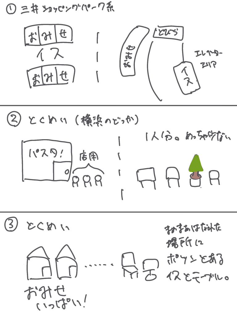 三井ショッピングモール系は至る所に椅子がありとても助かる。店と椅子の融合が素晴らしい。